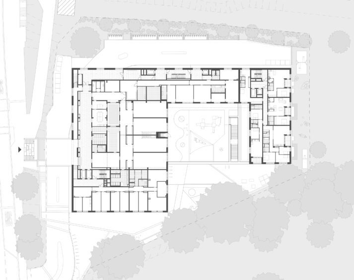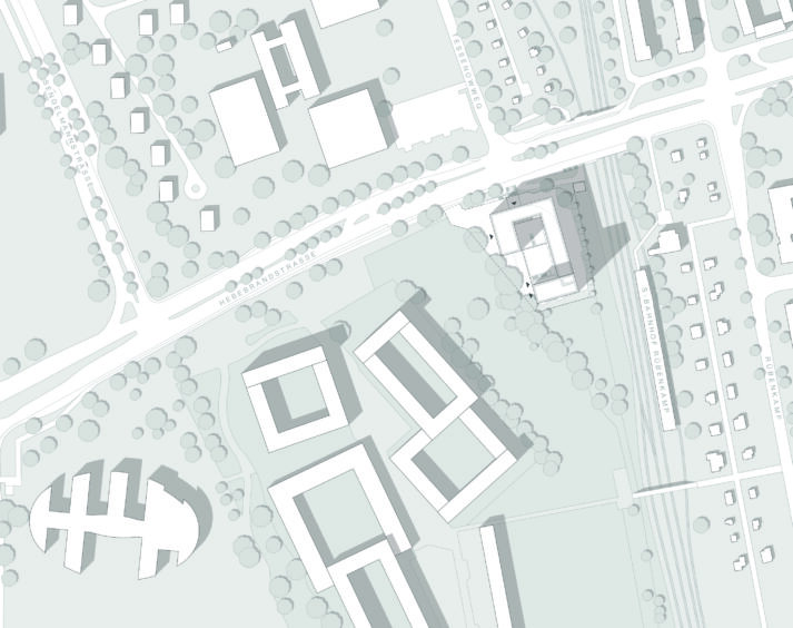 Das Baufeld 4 zeichnet sich durch seine exponierte Lage aus: Direkt an der Hebebrandstraße und unmittelbar neben der S-Bahnstation Rübenkamp gelegen, markiert ein solitärer Baukörper den Auftakt eines neuen Stadtquartiers. In Anlehnung an das Gestaltkonzept für das Pergolenviertel wird mit diesem eine Modulation der vorherrschenden, orthogonalen Hoftypologie vorgenommen, welche die Vorgabe einer städtebaulichen Dominante unter Berücksichtigung einer optimalen Orientierung aller Wohnungen in einer transformierten Baukörperfigur verarbeitet. Durch eine großzügige Öffnung an der südwestlichen Gebäudeseite tritt der Innenbereich der Anlage in direkte Beziehung zum angrenzenden Quartierspark. Mit einer Überhöhung der südlichen Gebäudeflanke wird das Motiv einer ganzheitlich angelegten Gebäudefigur bei gleichzeitiger Herausarbeitung einzelner Gebäudeteile gestärkt.
