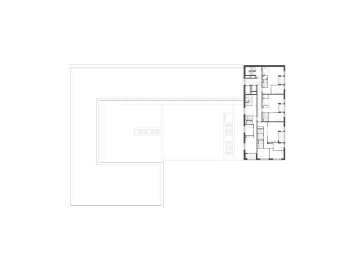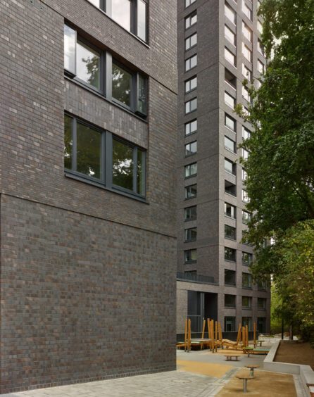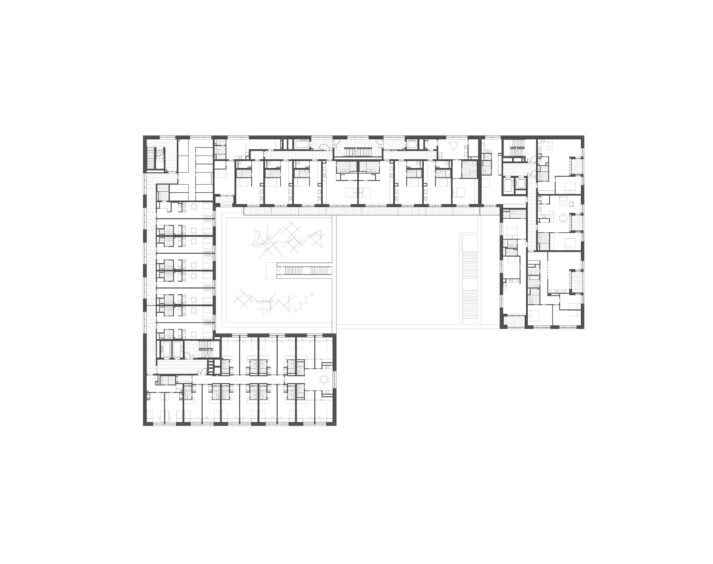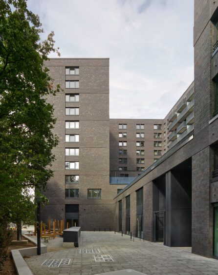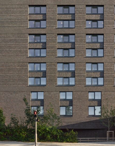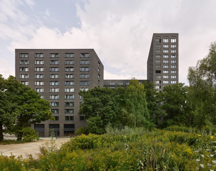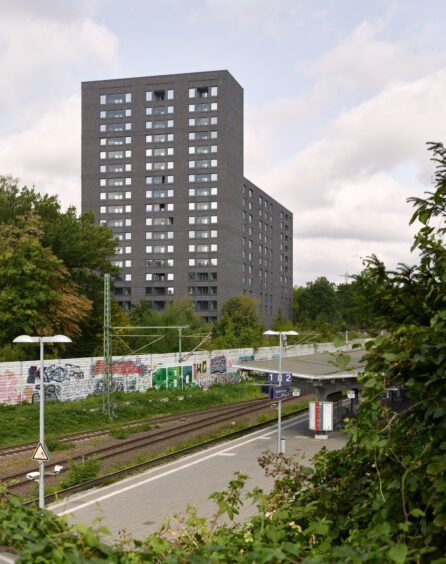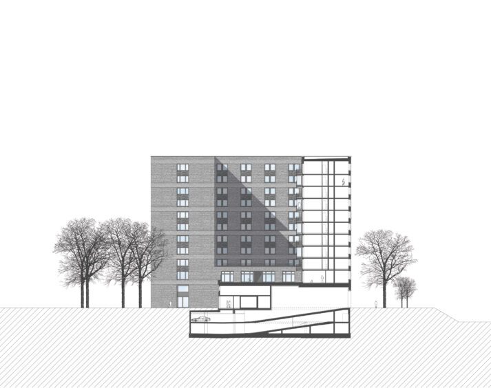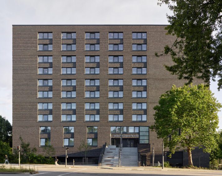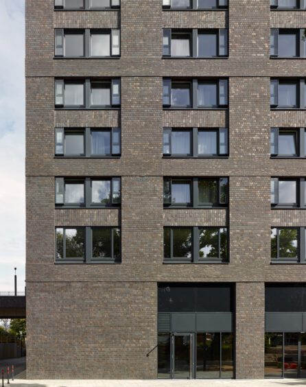 Die Gliederung der Backsteinfassaden spiegelt die Disposition des Baukörpers mit lärmexponierten und beruhigten Bereichen wieder. Während der südliche und der westliche Kopf der Anlage durch eine Lochfassade mit großen Fensterformaten für die dahinterliegenden Wohnräumen geprägt ist, werden die beiden sie verbindenden nördlichen und östlichen Riegel auf ihren Erschließungsseiten mit einem bandartigen Fassadenmotiv belegt. Die Köpfe eröffnen somit über die großen Fenster den Blick in den Landschaftsraum; der abgewinkelte Riegel hingegen reagiert auf die lineare Dynamik der angrenzenden Verkehrswege.